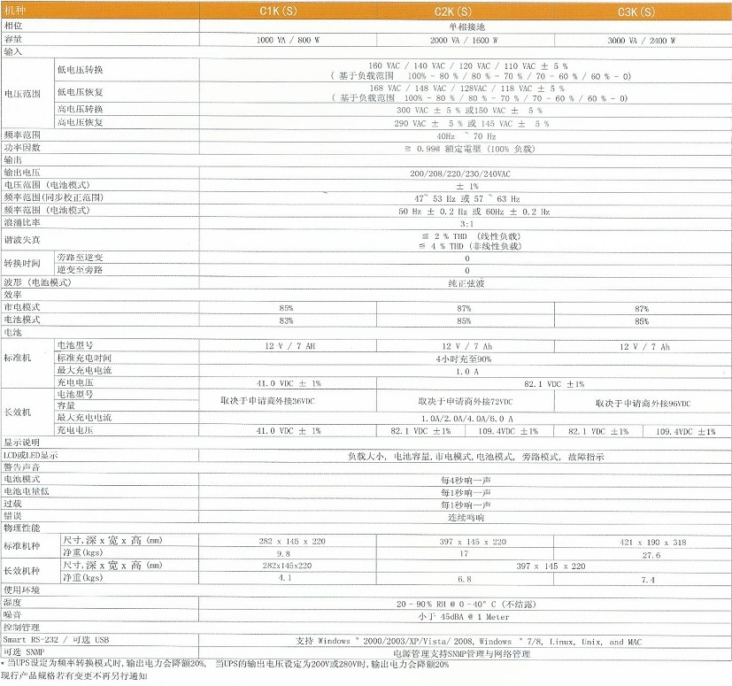 美国山特SAGTAR C1K(S)-C3K(S)技术参数: